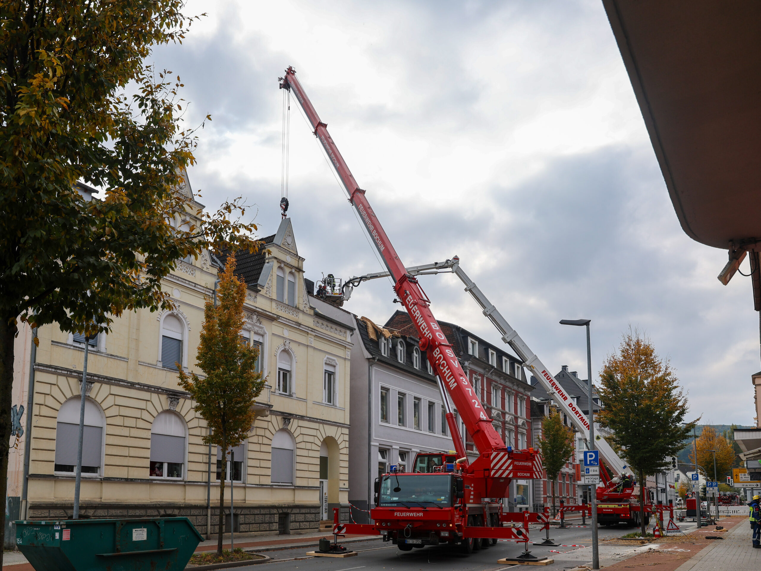 Der Teileinsturz des Daches eines dreigeschossigen Wohnhauses in der Hagener Straße hat am Samstagnachmittag einen umfangreichen Großeinsatz von Feuerwehr, Technischem Hilfswerk (THW), Rettungsdienst und Polizei ausgelöst. Die Alarmierung erfolgte am Samstagnachmiitag gegen 15.30 Uhr. Beim Eintreffen der ersten Kräfte zeigte sich, dass große Teile des Daches aus bislang ungeklärter Ursache auf die Straße gestürzt waren. Weitere Abschnitte drohten nachzurutschen.